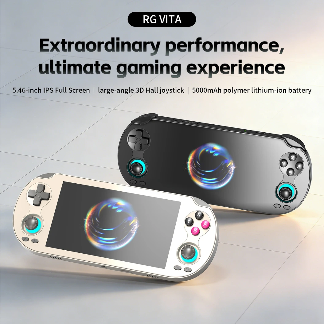 RG Vita brings back that classic PlayStation Vita feel in a modern, budget-friendly package. It sports a vibrant 5.46-inch IPS touchscreen with 720p resolution, powered by the reliable Unisoc T618 processor and 3GB of RAM. With 64GB of internal storage (expandable via microSD), Hall Effect analog sticks, a solid 5000mAh battery, and comfortable ergonomics, it’s an excellent choice for players who want reliable handheld emulation. It handles retro systems like PSP, Dreamcast, N64, and lighter PS2 titles smoothly, while also supporting native Android games and apps.