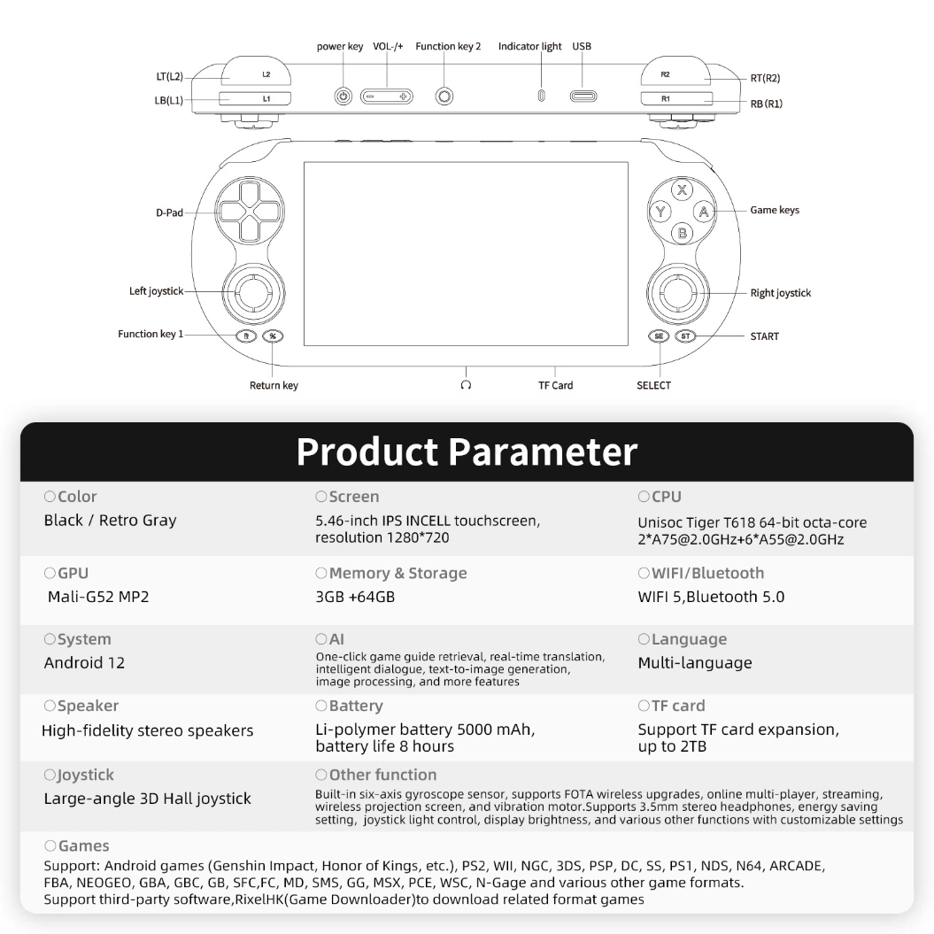 A compact, affordable PS Vita-inspired handheld running Android 12. It features a 5.46-inch 720p touchscreen, Unisoc T618 processor, 3GB RAM, and 64GB storage. Great for smooth retro emulation up to PSP, Dreamcast, and N64, plus casual Android gaming on the go.