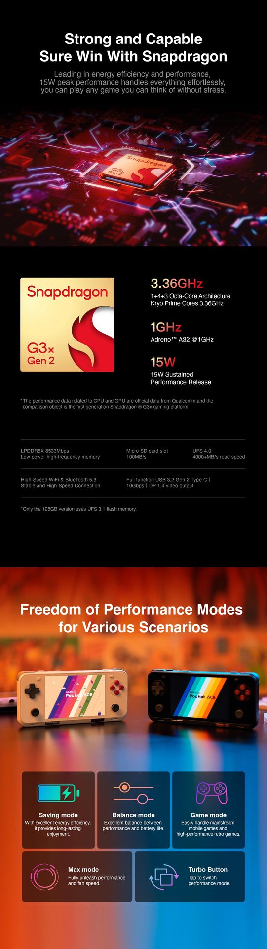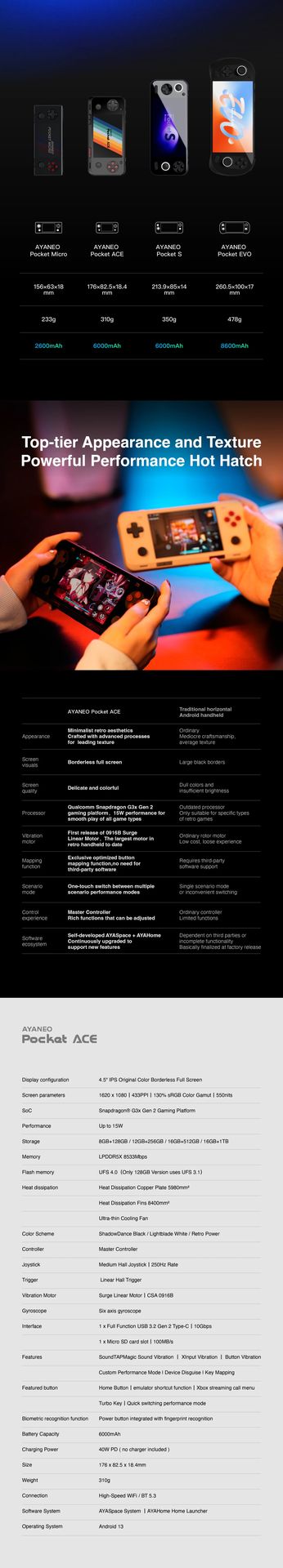 The Ayaneo Pocket ACE G3X Gen2 is a high-end emulation monster with a perfect GBA aspect ratio screen, crisp high-resolution display, precise Hall Effect sticks, smooth 8 GB RAM, and a huge 6000 mAh battery. Its responsive touchscreen nails navigation and touch games, while lets you go big-screen, all with full Android game/app access in a premium, pocket-friendly metal body.
