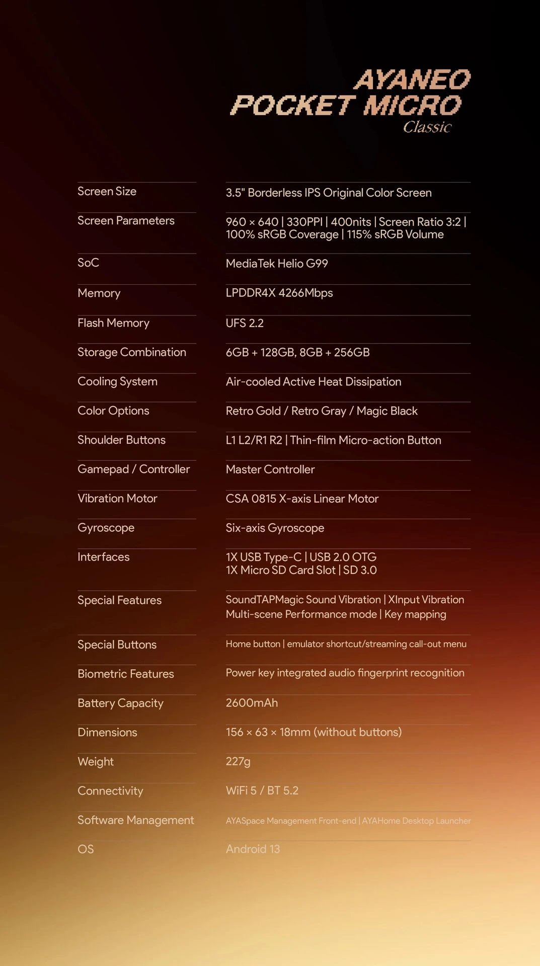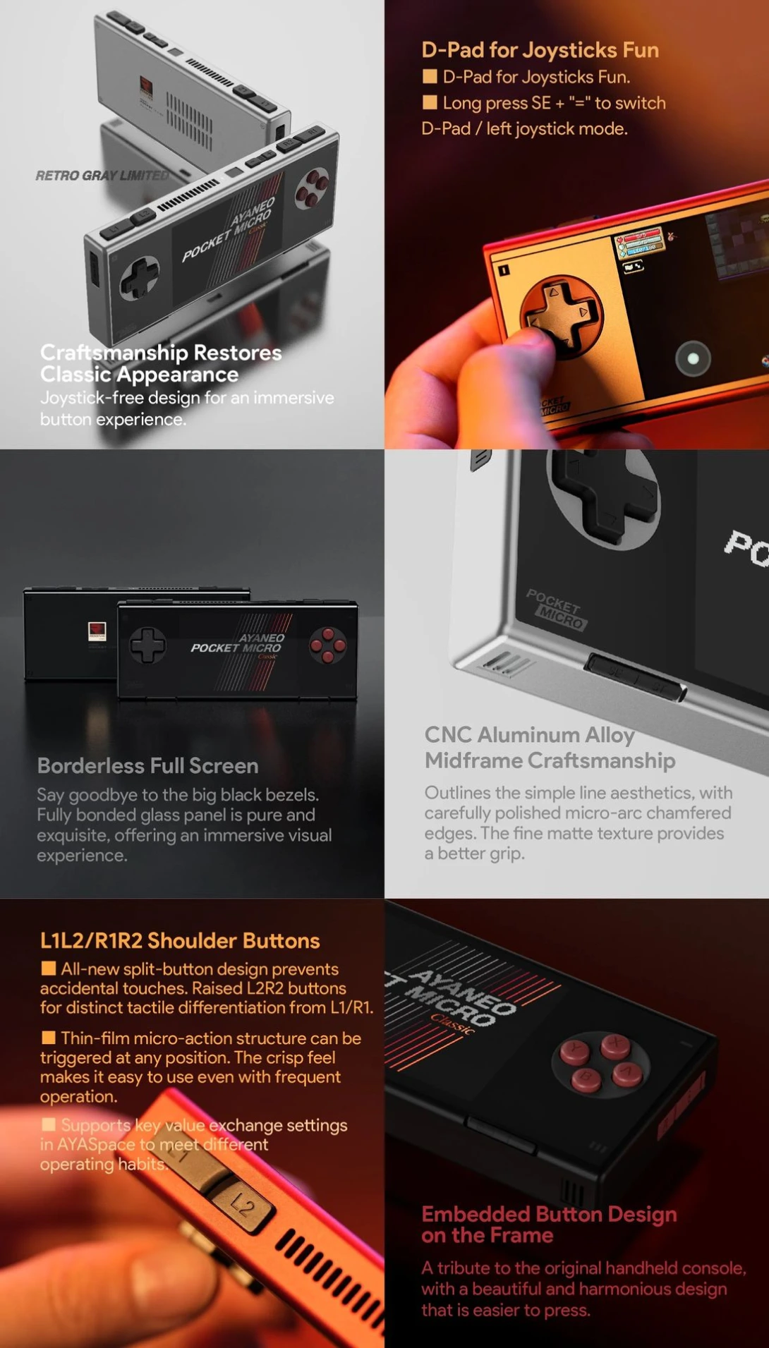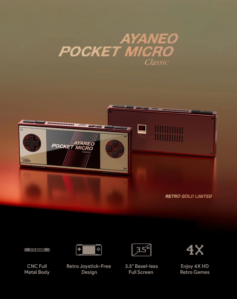 The Ayaneo Pocket Micro Classic is a gorgeous, premium-feeling metal handheld with flawless GBA aspect ratio screen, making every Game Boy Advance title look absolutely perfect. Packed with 6 GB of RAM for silky-smooth navigation, a responsive touchscreen ideal for menus and touch/stylus games, and full access to Android mobile games and apps, it blends nostalgic design with modern performance in a tiny, pocketable masterpiece.